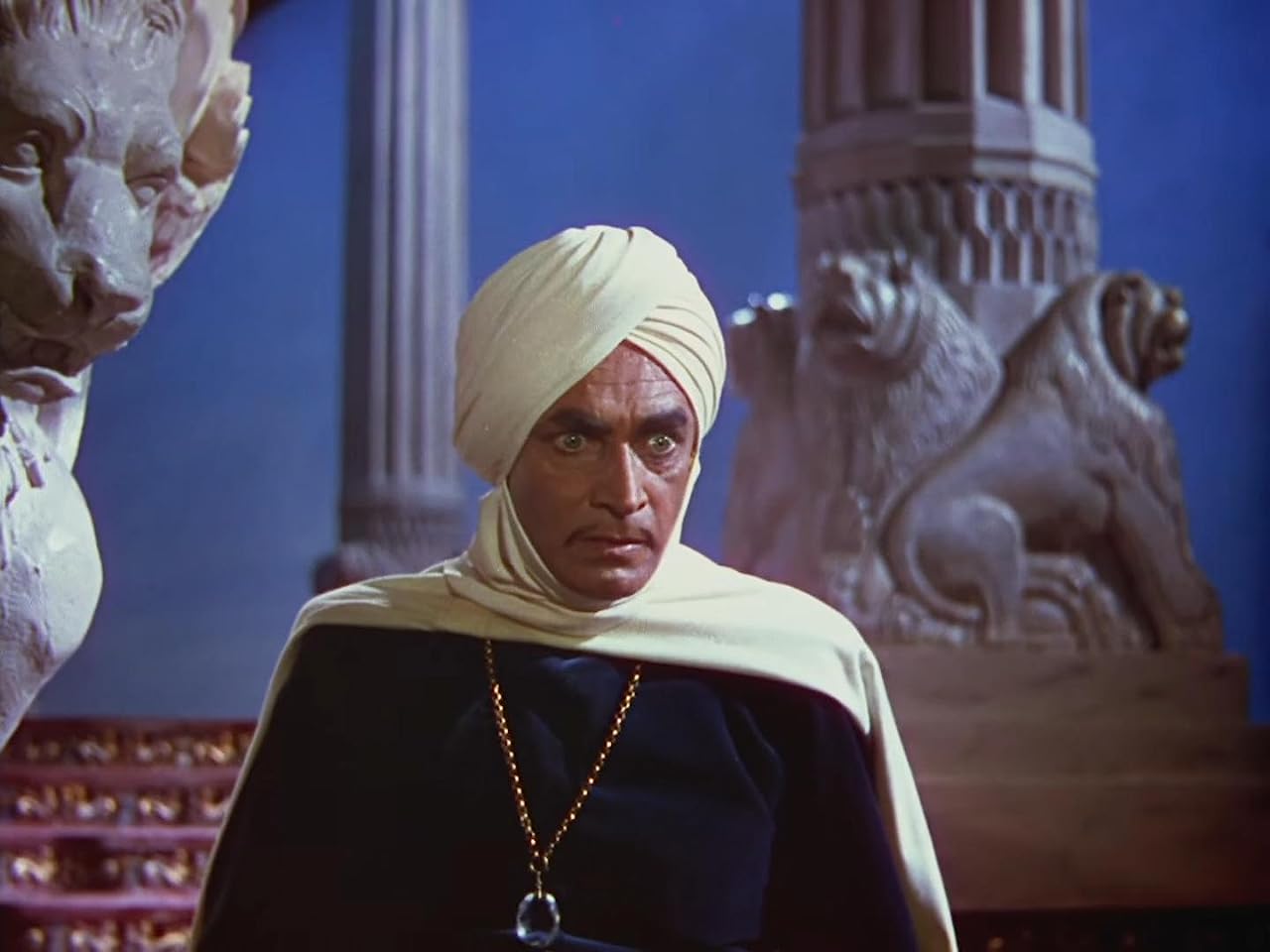 Once Ahmad is out of the castle and pretending to be a humble beggar, Jaffar has him arrested, and thrown in prison — later telling the people that Ahmad died, so Jaffar can claim the throne. Ahmad meets a young thief while in his cell called Abu (played by then 15-year-old Sabu Dastagir, who just went by “Sabu” in his film career).