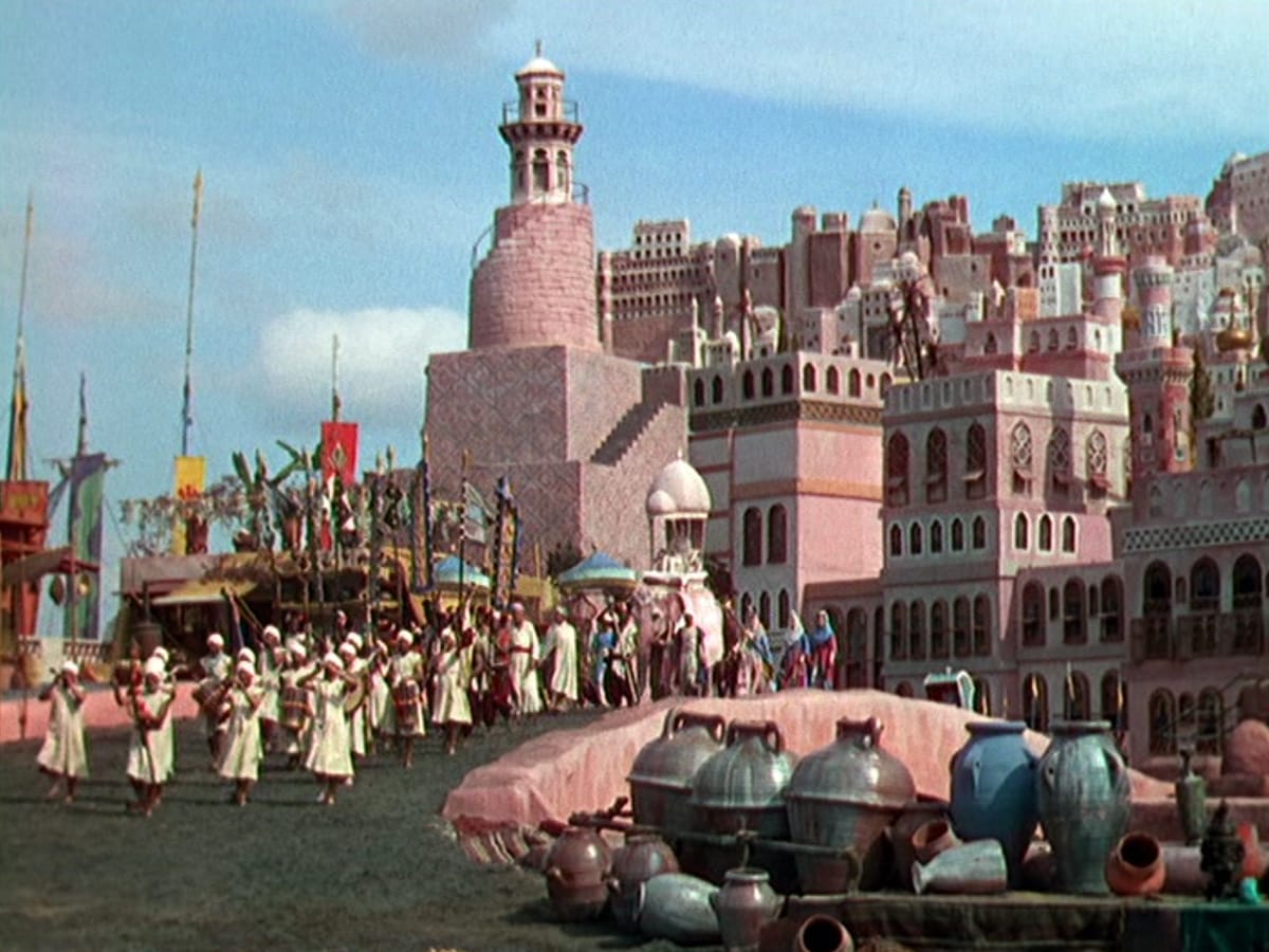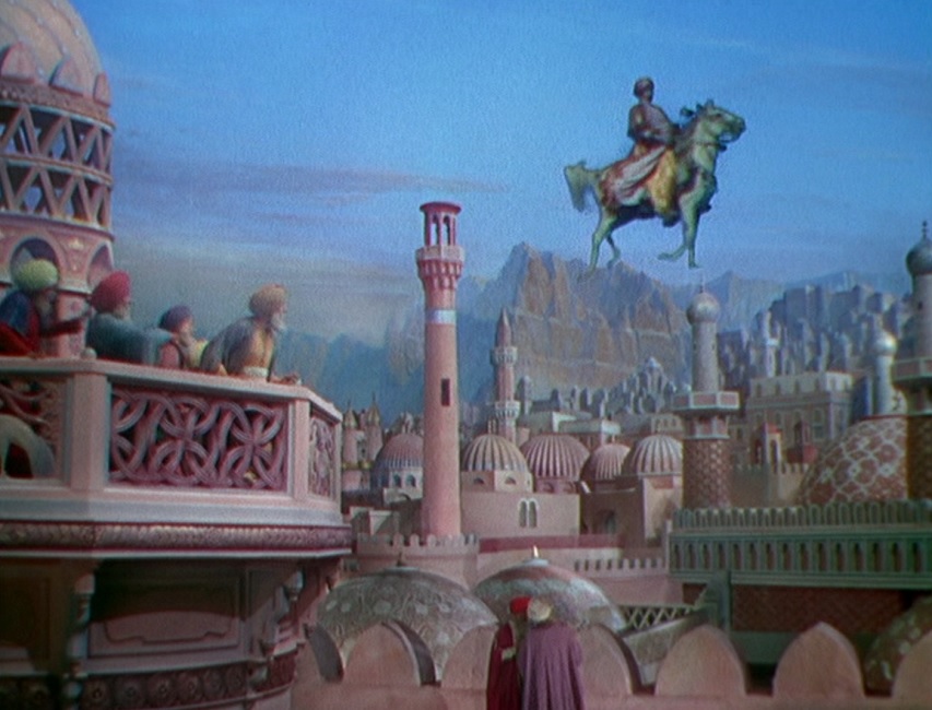 Abu then breaks his giant jewel out of anger, which introduces a handy plot device to get him also back to Baghdad via a flying carpet (very well done compared to the flying horse effects), the appearance of which triggers the population into overthrowing Jaffar, who is then killed by Abu, restoring Ahmad to power and allowing him to marry the Princess, who never did get an actual name.