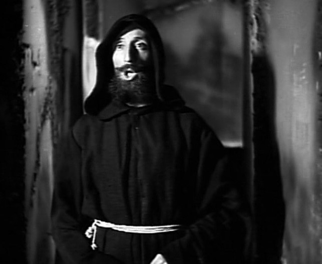 The lights are on in the convent, but at first there appears to be nobody home. Eventually the Prior (a wonderfully wizened Paco Martinez) appears, explaining that the other monks have taken vows of silence, and welcoming the trio to stay the night and find their way back in the morning. Walking through the convent, our heroes notice various oddities, such as how old-fashioned the monks appear to be, including a self-flagellating monk (in shadow), and a tumbled cabinet near a room that Alphonso attempts to straighten, but which reverts the moment his back is turned.