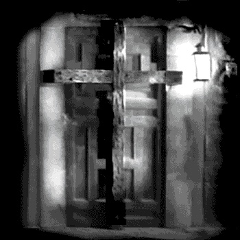 The “wandering around” part is reprised a few times, including once where our heroes come across a room with a dozen or so open – and empty – coffins. They also come across a door to one of the cells that is blocked, and has a huge crucifix nailed to it – to keep something out, or to lock something in?